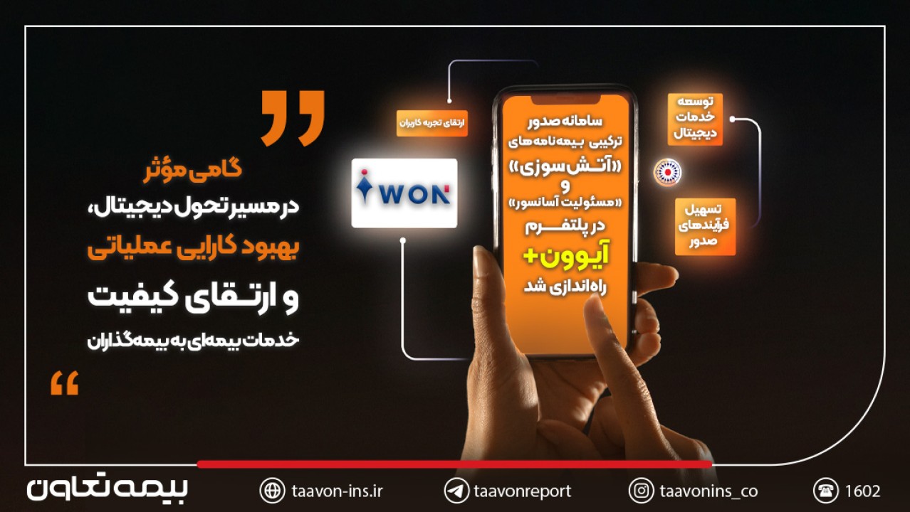 سامانه صدور ترکیبی بیمه‌نامه‌های «آتش‌سوزی» و «مسئولیت آسانسور» با هدف تسهیل فرآیندهای صدور، ارتقای تجربه کاربران و توسعه خدمات دیجیتال، در پلتفرم خدمات الکترونیک آیوون+ راه‌اندازی و آماده بهره‌برداری شد.
