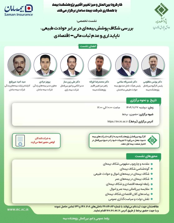 کارگروه بین‌الملل و میز تغییر اقلیم پژوهشکده بیمه با همکاری شرکت بیمه سامان، نشست تخصصی «بررسی شکاف پوشش بیمه‌ای در برابر حوادث طبیعی؛ ناپایداری و عدم ثبات مالی–اقتصادی» را روز دوشنبه ۲۷ بهمن‌ماه ۱۴۰۴ از ساعت ۱۰ تا ۱۲ به‌صورت حضوری و برخط برگزار می‌کند.
