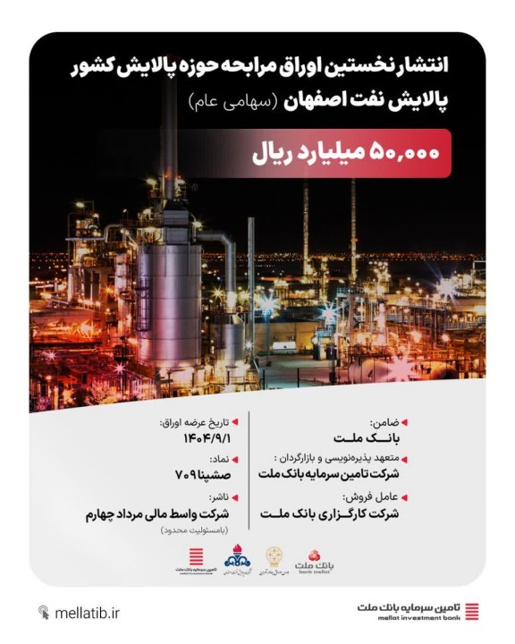 همزمان با آغاز هفته بازار سرمایه و با حضور رئیس‌جمهور، رئیس سازمان بورس و مقامات ارشد اقتصادی کشور، نخستین اوراق مرابحه صنعت پالایشی کشور برای شرکت پالایش نفت اصفهان به ارزش ۵۰ هزار میلیارد ریال با ضمانت بانک ملت و تعهد پذیره‌نویسی و بازارگردانی شرکت تأمین سرمایه بانک ملت منتشر شد. این اقدام با هدف تأمین مالی یکی از مهم‌ترین پروژه‌های زیست‌محور و راهبردی کشور انجام گرفته است.