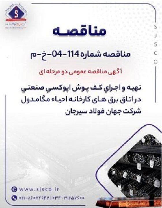 شرکت جهان فولاد سیرجان در نظر دارد نسبت به تهیه و اجرای کفپوش اپوکسی صنعتی در اتاق برقهای کارخانه احیاء مگامدول از طریق برگزاری مناقصه عمومی دو مرحلهای اقدام کند.