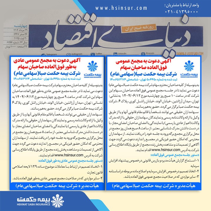 شرکت بیمه حکمت صبا دو مجمع عمومی عادی بهطور فوقالعاده و عمومی فوق العاده برگزار خواهد کرد.