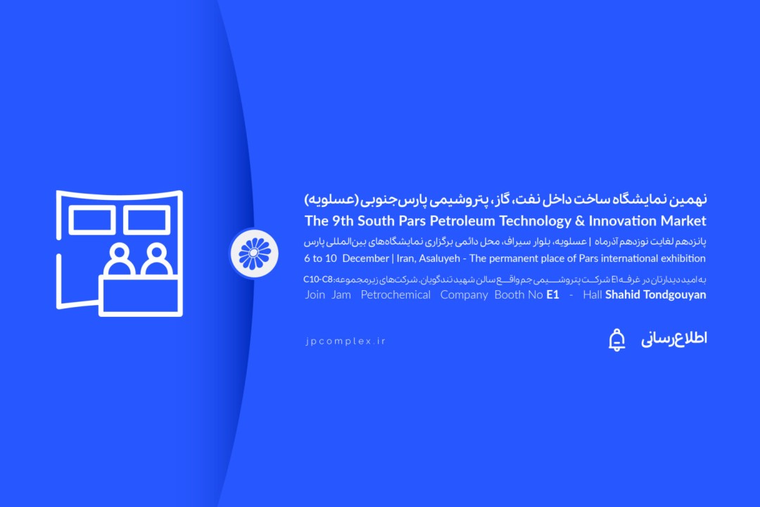 شرکت پتروشیمی جم در سالن شهید تندگویان غرفه شمارهE1 از ساعت 9:00 الی 17:00 پذیرای متخصصان و مدعوین گرامی است.