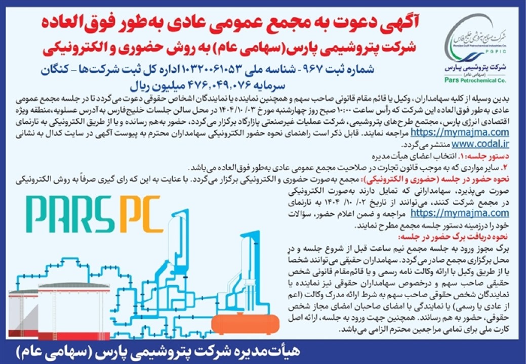 متن آگهی دعوت به مجمع عمومی عادی به طور فوق العاده شرکت پتروشیمی پارس(سهامی عام) به روش حضوری و الکترونیکی به شرح زیر است: