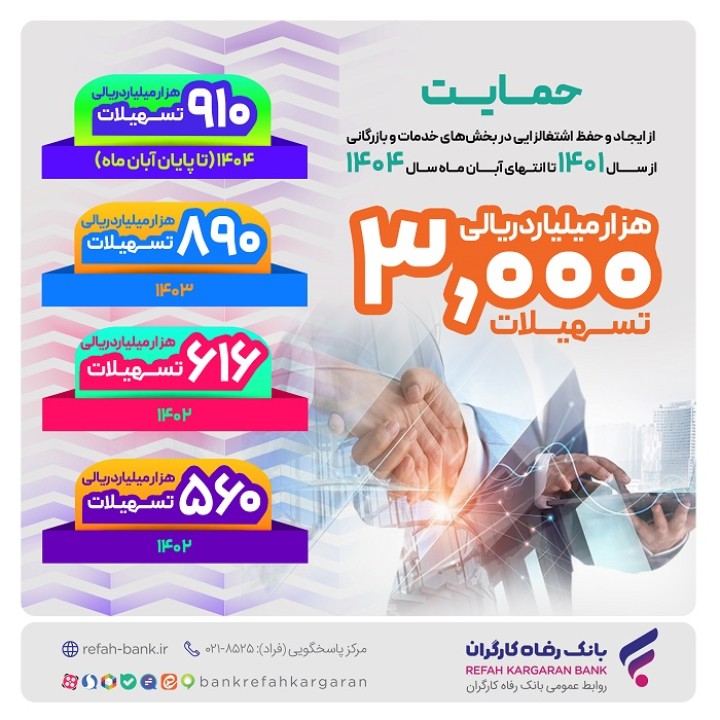 به گزارش روابط عمومی بانک رفاه کارگران، این بانک از ابتدای سال جاری تاپایان آبان ماه حدود 910.000 میلیارد ریال تسهیلات در این بخشها پرداخت کرده که در مقایسه با سال گذشته از رشد قابل توجهی برخوردار بوده است. بر اساس این گزارش، تسهیلات پرداختی بانک در این حوزهها در سال گذشته نیز با 44 درصد رشد در مقایسه با سال 1402 به بیش از 890.000 میلیارد ریال رسید.